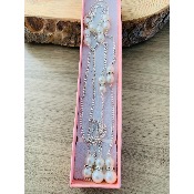 Sa chaîne argentée de 55 cm, fine mais résistante, épouse la nuque avec délicatesse, glissant doucement le long du dos dans une chute harmonieuse.
